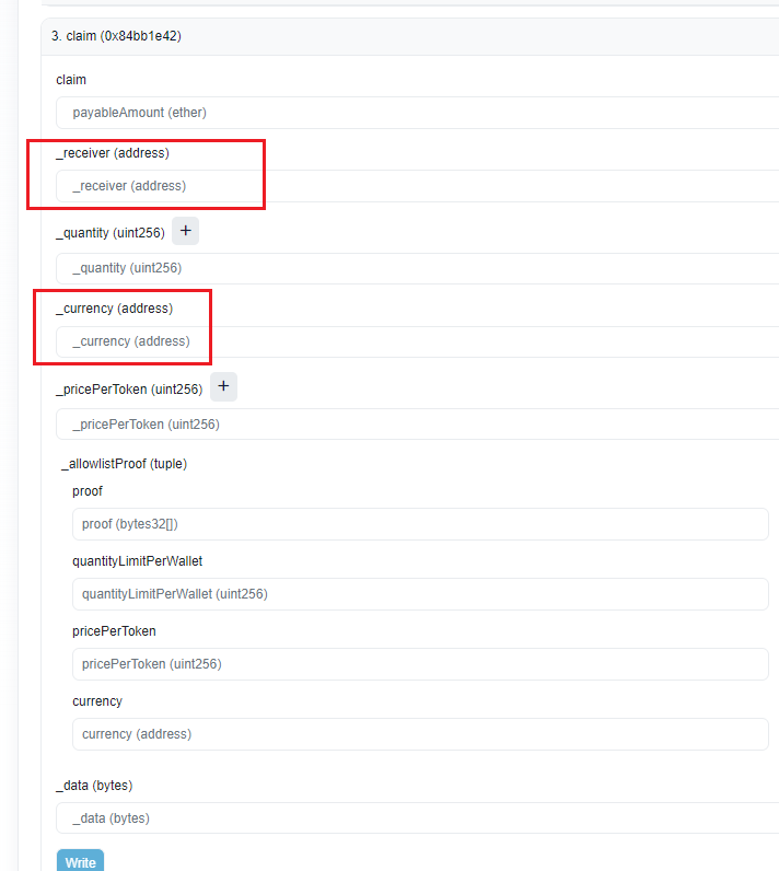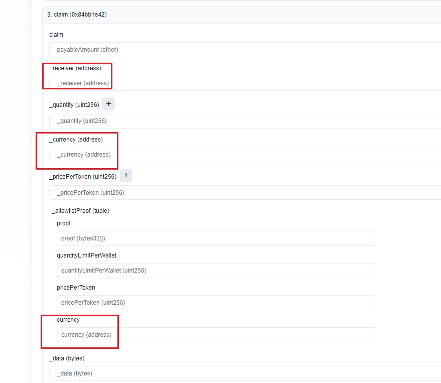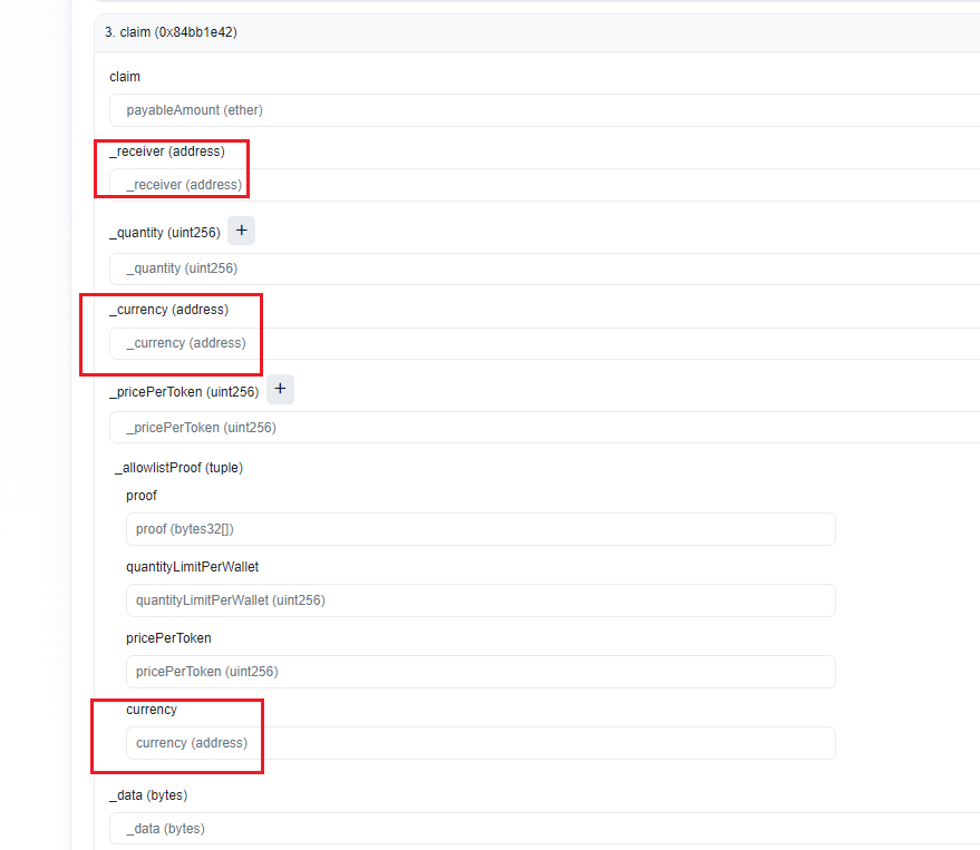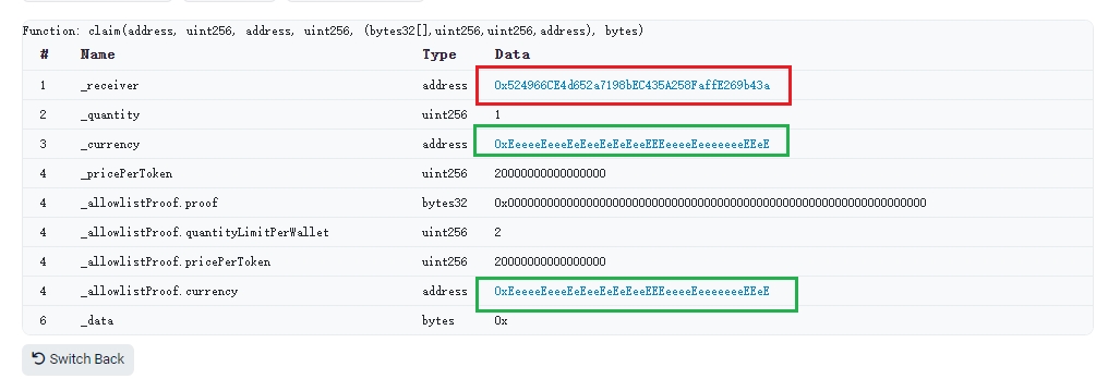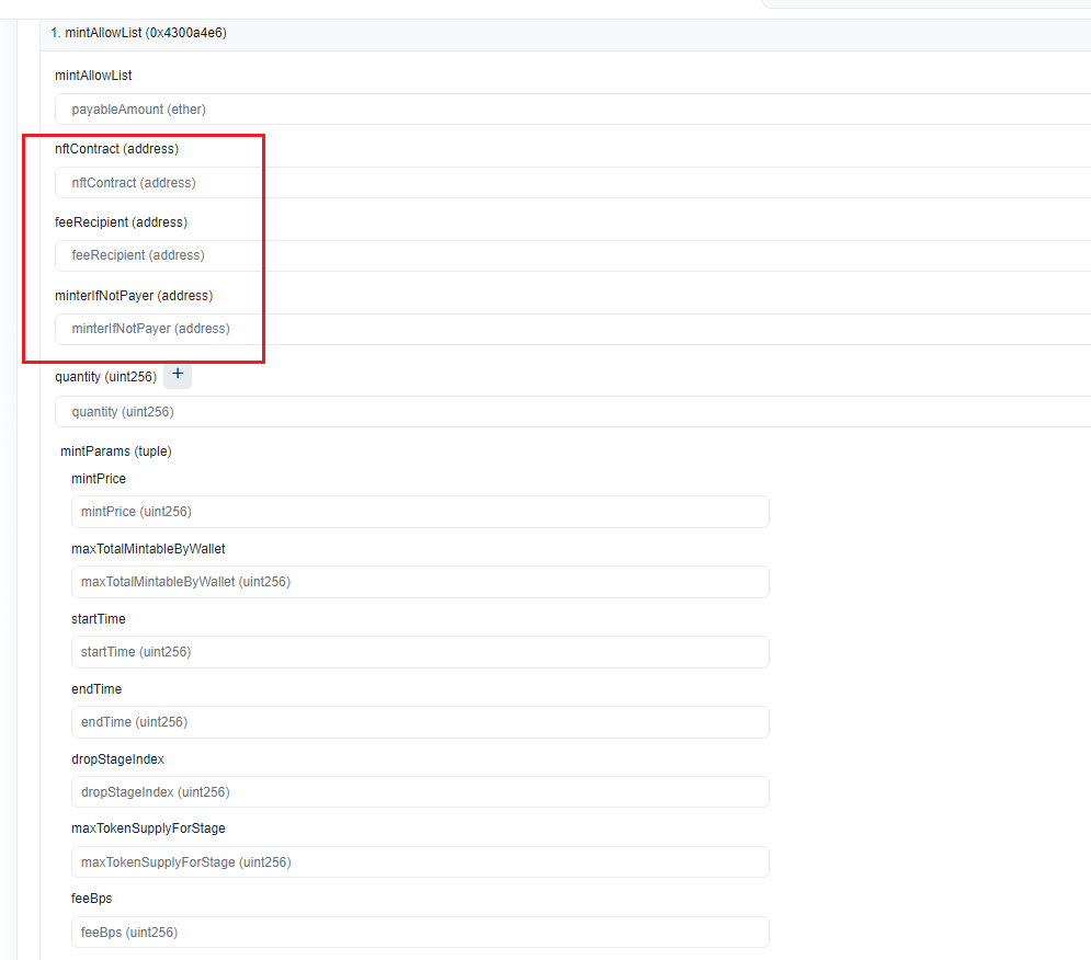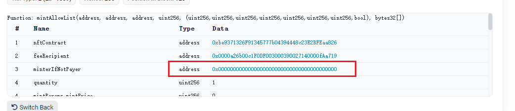 如图所示,这个合约方法里面有两个地址参数,通过名称我们就能分析到,第一个参数是项目方地址,第二个参数则是把nft mint给谁,也就是打给谁的地址,这个地址就是需要处理的。