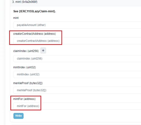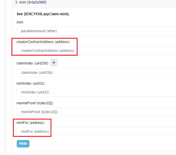 如图所示,这个合约方法里面有两个地址参数,通过名称我们就能分析到,第一个参数则是把nft mint给谁,也就是打给谁的地址,这个地址就是需要处理的。第二个参数你可能短时间读不懂,没关系,我们回头看下这个方法成功调用的一条tx里面参数。