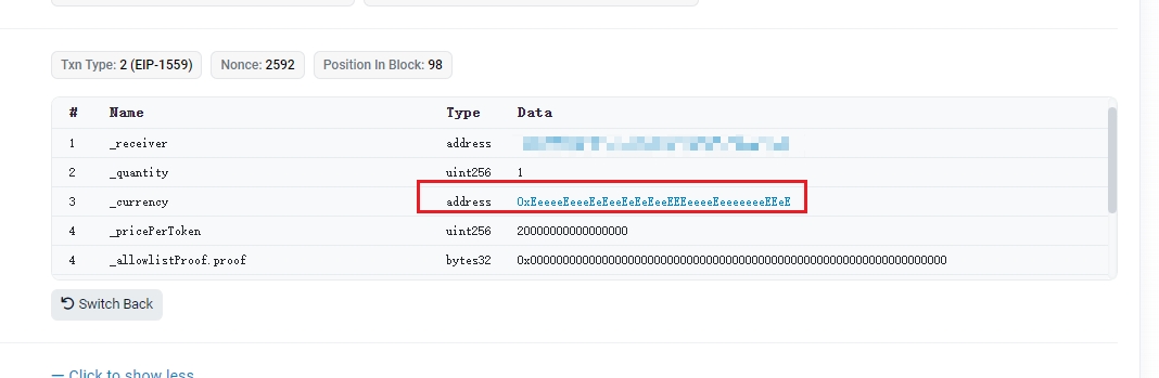 如图所示,这个合约方法涉及3个地址。通过简单的读名称,我们知道第一个是接受地址参数,需要替换,后面两个参数都是currency,这个参数是老朋友了,99%的情况传入的参数都是上面说的免处理情况,那是不是这个情况呢,我们找到一条成功的tx印证想法