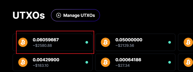 找到你钱包里面,绿色标记的utxo就是可用的,尽量选取大的utxo,避免钱不够的问题