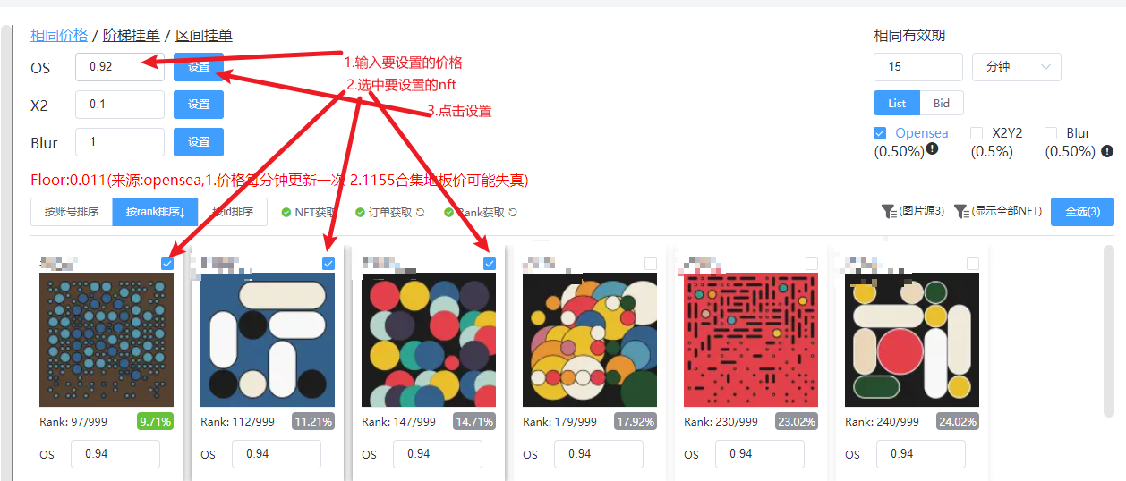 三种挂单规则,根据自己需要,设置好数值,然后选中你要设置的nft,最好点设置价格。