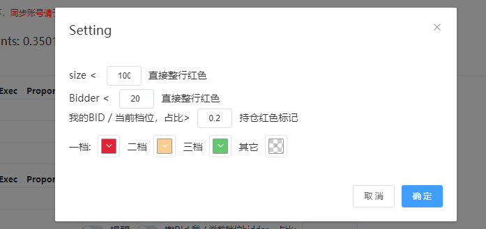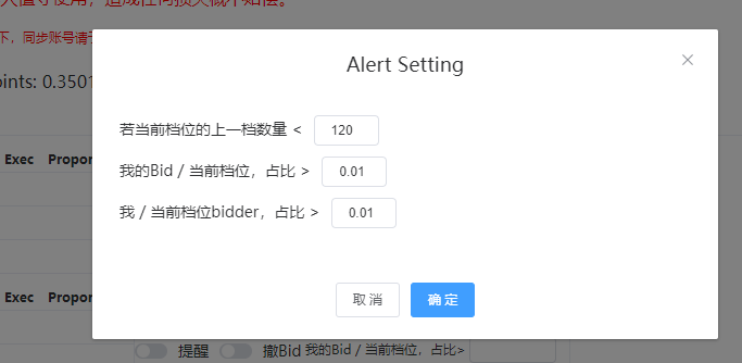 这里是全局提醒设置,设置后会覆盖所有合集。仓位占比和bidder占比值的区间在 0 ~ 1 之间。