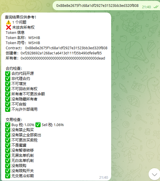 你也可以直接在tg bot主控端输入合约地址,也可以触发合约安全扫描。