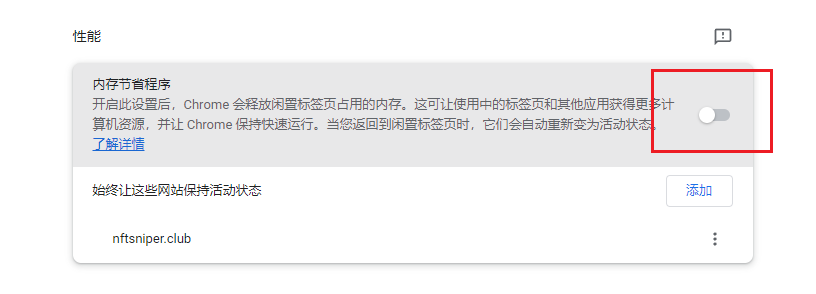 请关闭浏览器的内存节省模式。在浏览器中输入链接:chrome://settings/performance 调整设置。