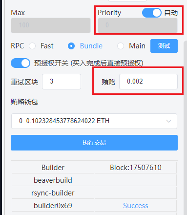 bundle:覆盖99%的构建器节点(红框部分),直接包含bloXroute构建器,用户无需再注册bloXroute,也不用再为免费版bloXrout限频和每日使用次数限制困扰。 在使用bundle时,有两种模式,你可以像普通交易一样拉小费,也可以通过贿赂来提高交易优先级,两者大部分情况下等效,再某些抢购模式下,同等gas支出bundle会更有优势。