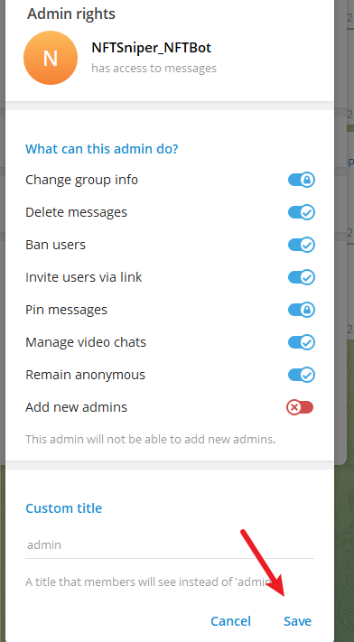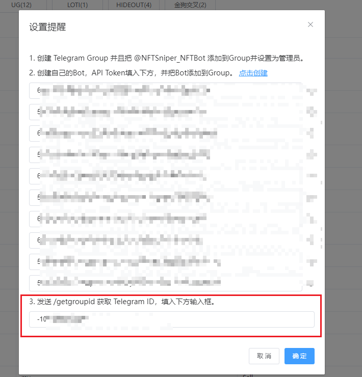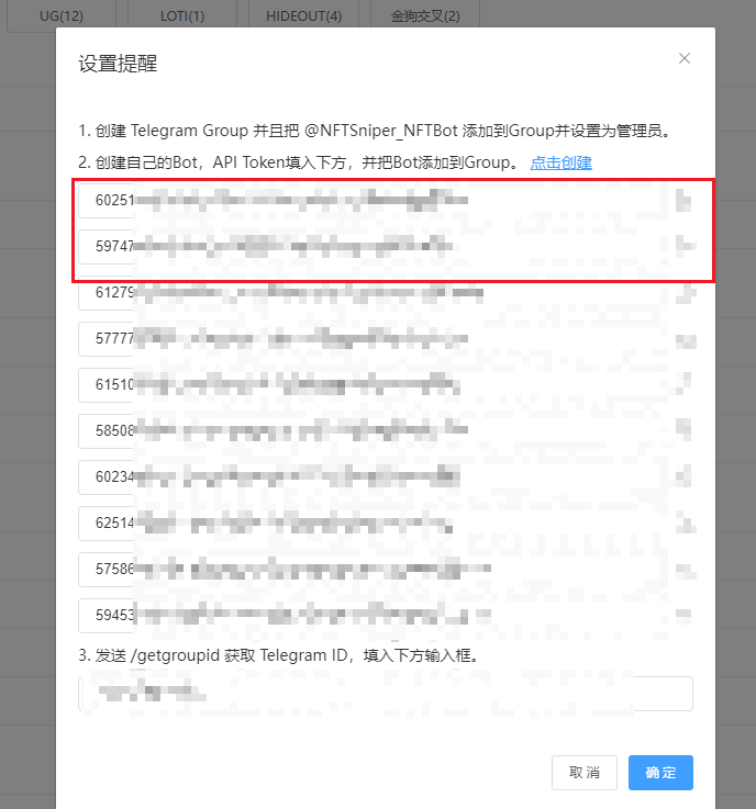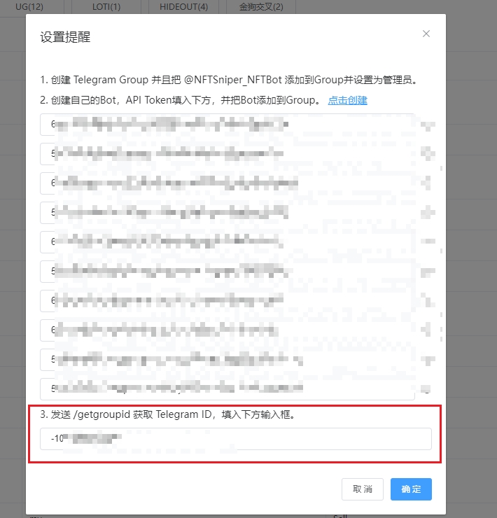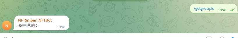 如果获取groupid失败,需要把 NFTSniper_NFTBot 设置为管理员,然后发送/getgroupid才能正确获取到。把查出来的id复制到bot里面配置
