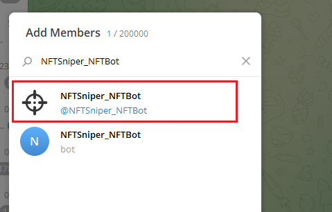 搜索框中输入 NFTSniper_NFTBot,点击搜出来的bot账号,认准下面有@NFTSniper_NFTBot 的正版bot