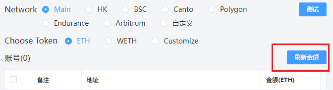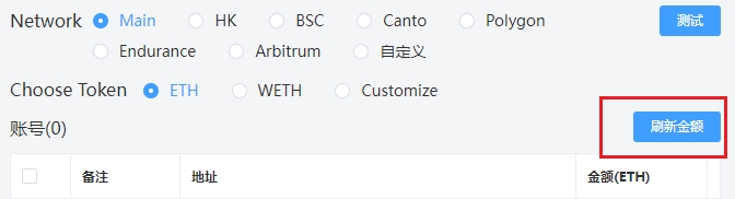 不管你是分发eth,还是erc20代币或者是其他链的币,上方网络和代币选好后,下发点击刷新金额。