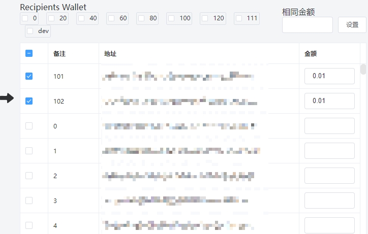 然后在右侧配置接收代币的地址。可以通过上方分组快速选择,也可以在下面勾选指定的账号。